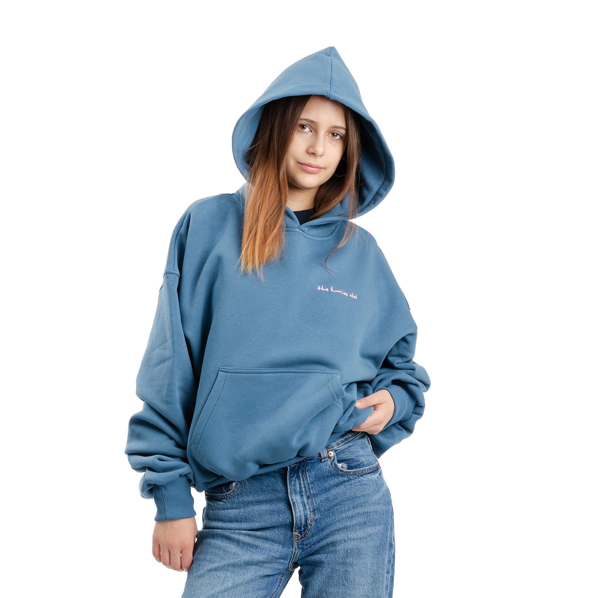 Bluza w kolorze niebieskim z kapturem, krój baggy.