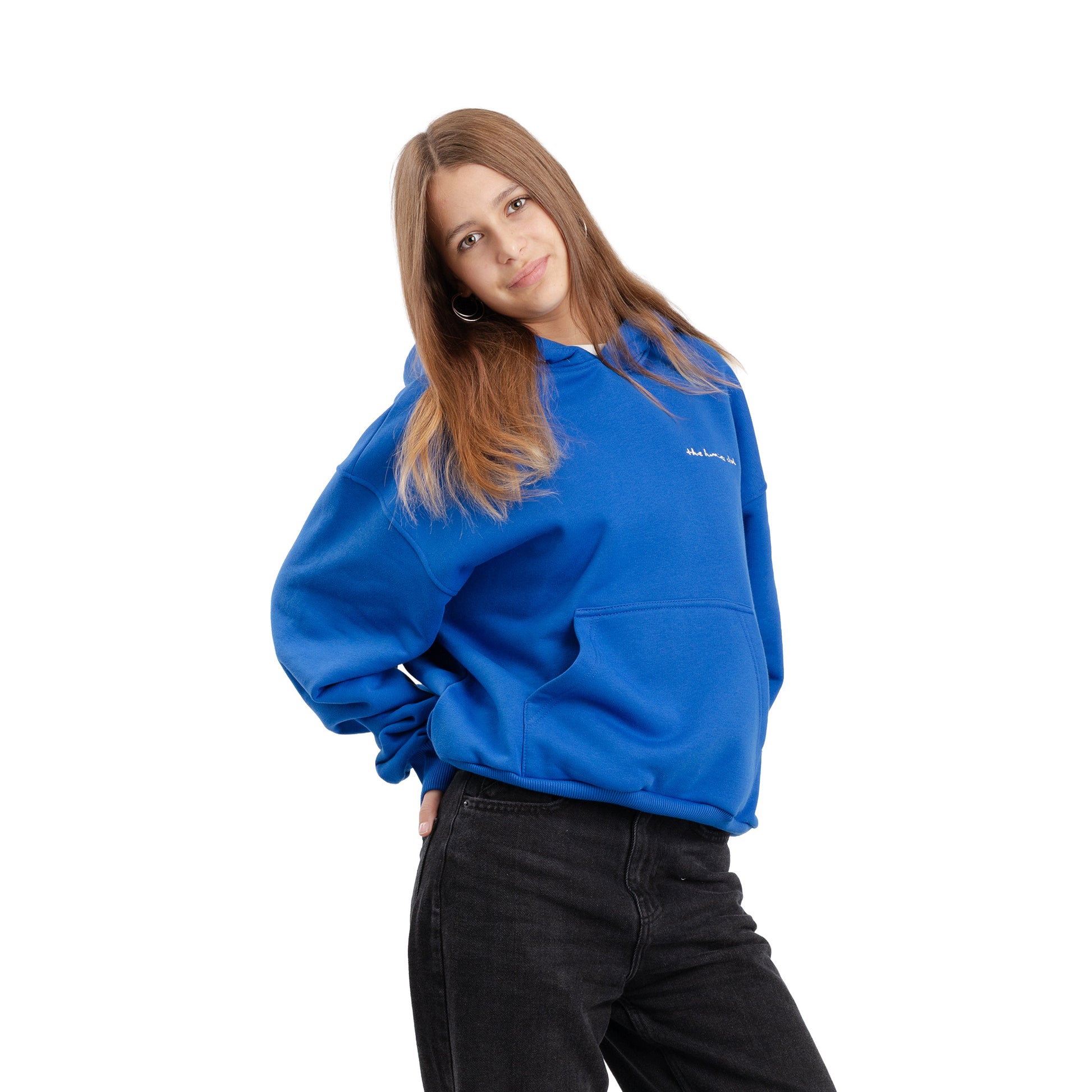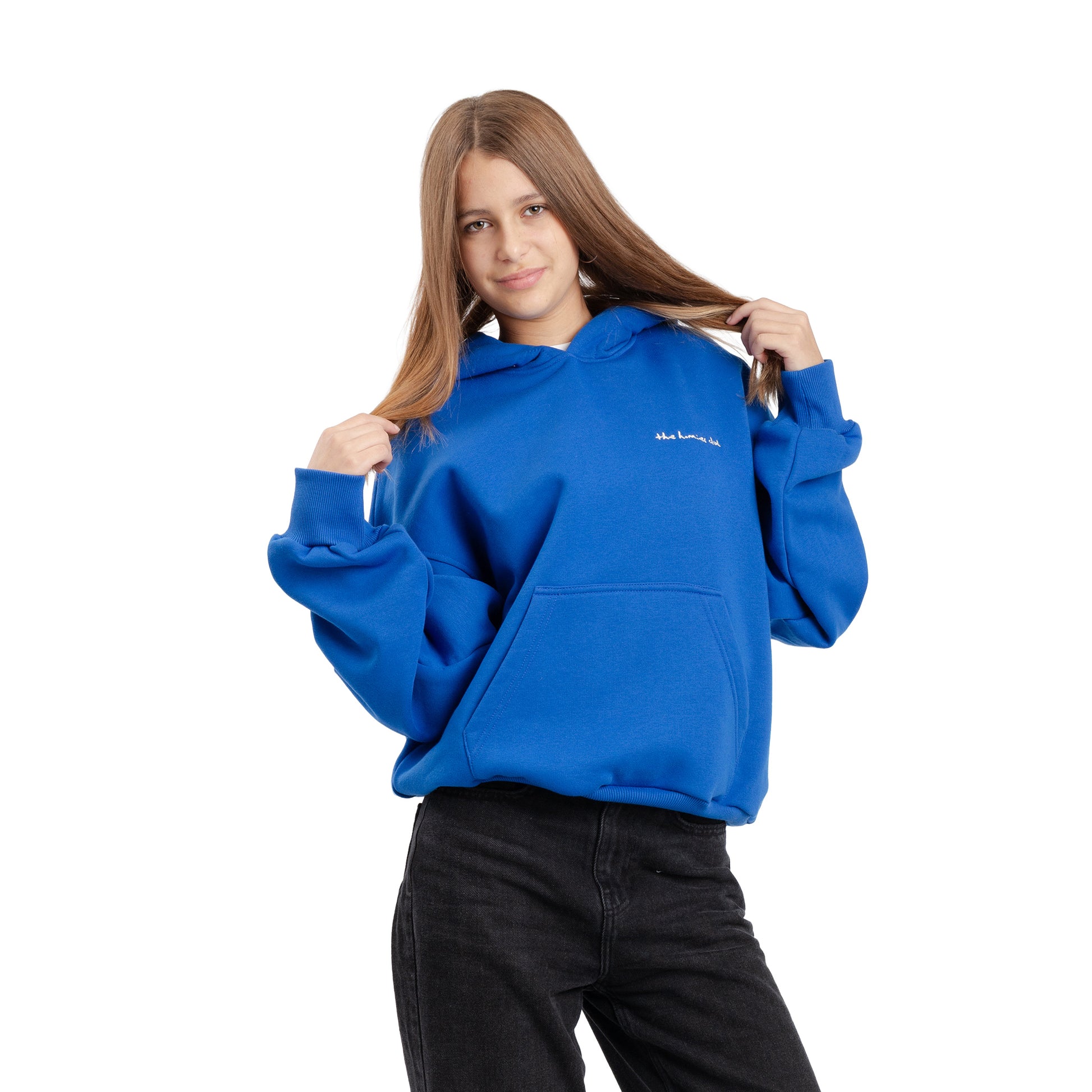 Bluza w kolorze chabrowym z kapturem, krój baggy.
