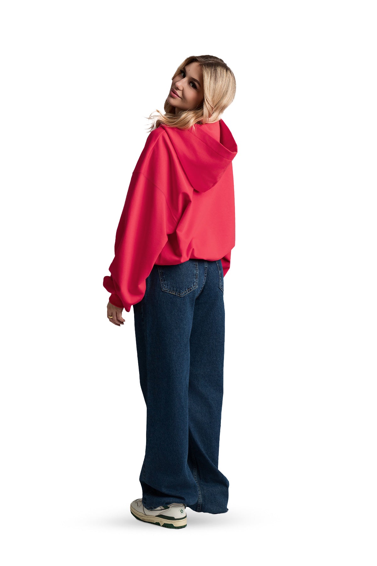 Czerwona bluza z kapturem, krój baggy.